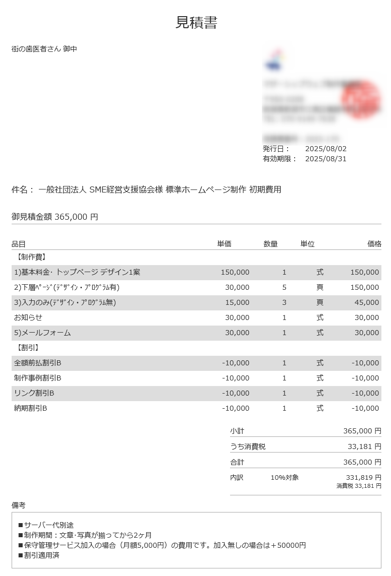 18万円のお見積りの場合、トップページのデザインが1案、修正3回までという限定があったり、公開後のサポートは2ページの簡単なマニュアル制作のみと記載されていますので、それも納得です。もし当方と同様のサポートを行った場合は、料金も同じくらいになりそうです。