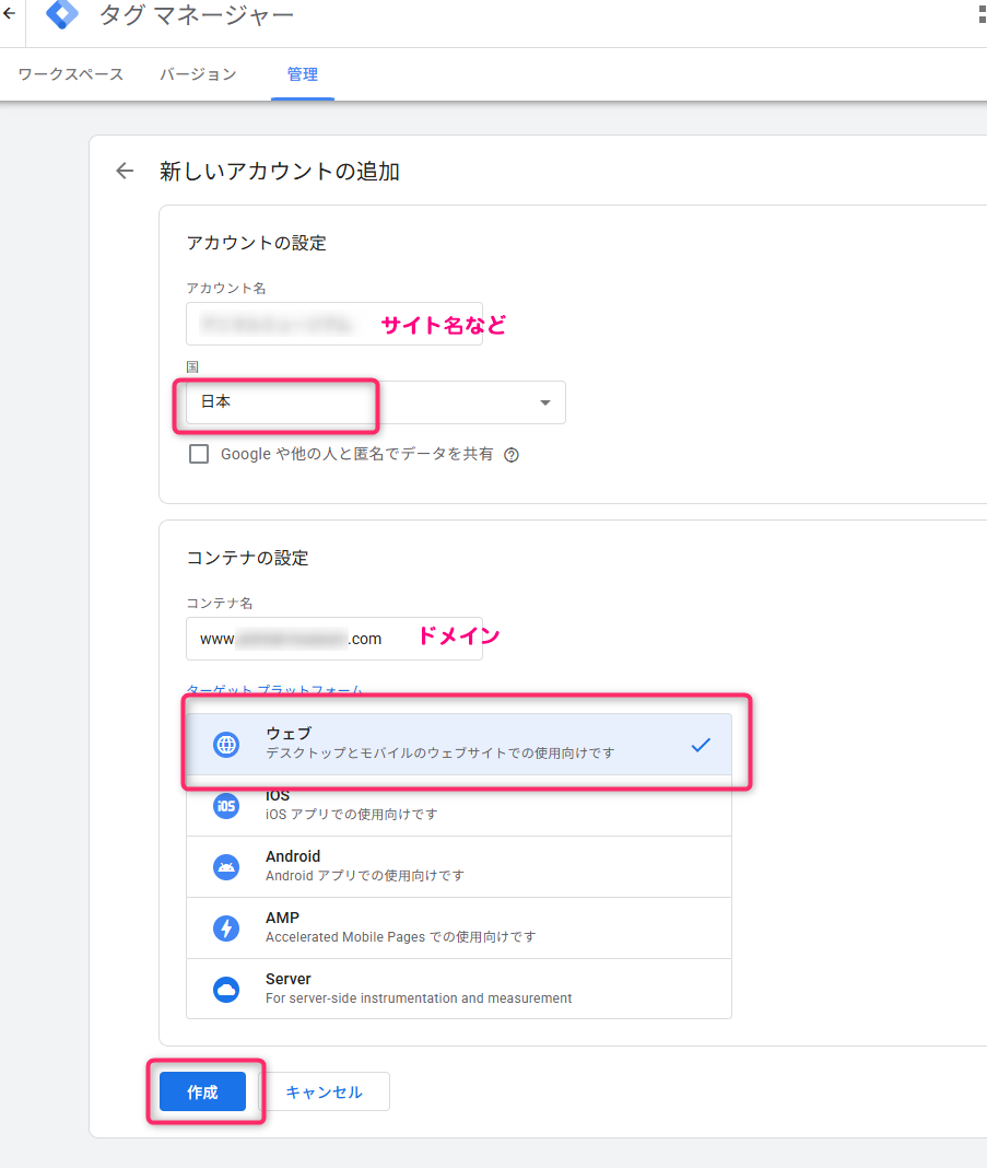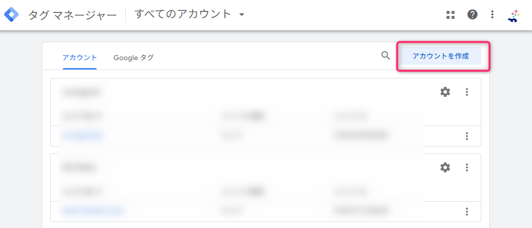 アカウントがない場合はGTMの画面でまずアカウントをしましょう。すでにある方は次のステップに進んでください。