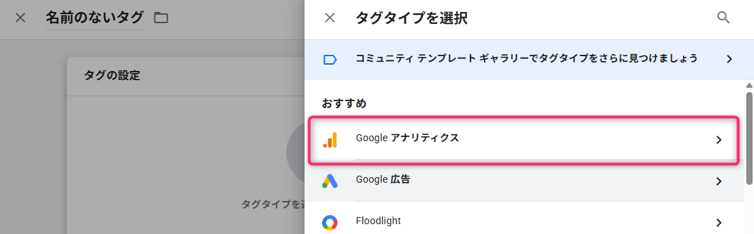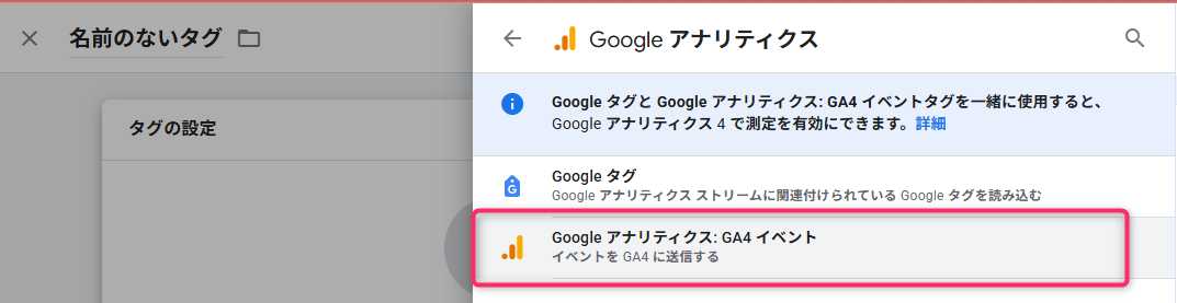 タグの設定→タグタイプを選択→Googleアナリティクス→Googleアナリティクス:GA4イベントを選択