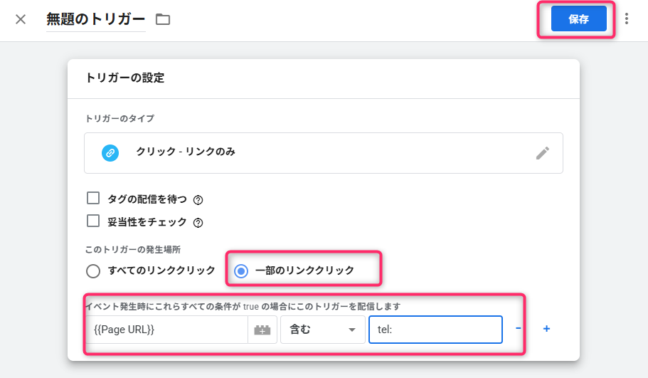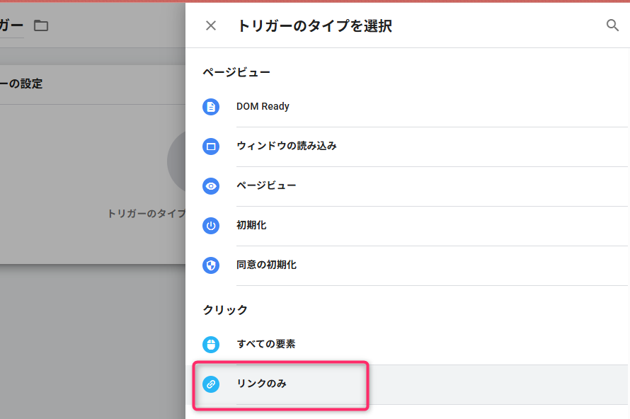 トリガータイプの選択画面で『クリック – リンクのみ』を選択