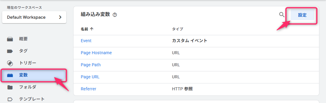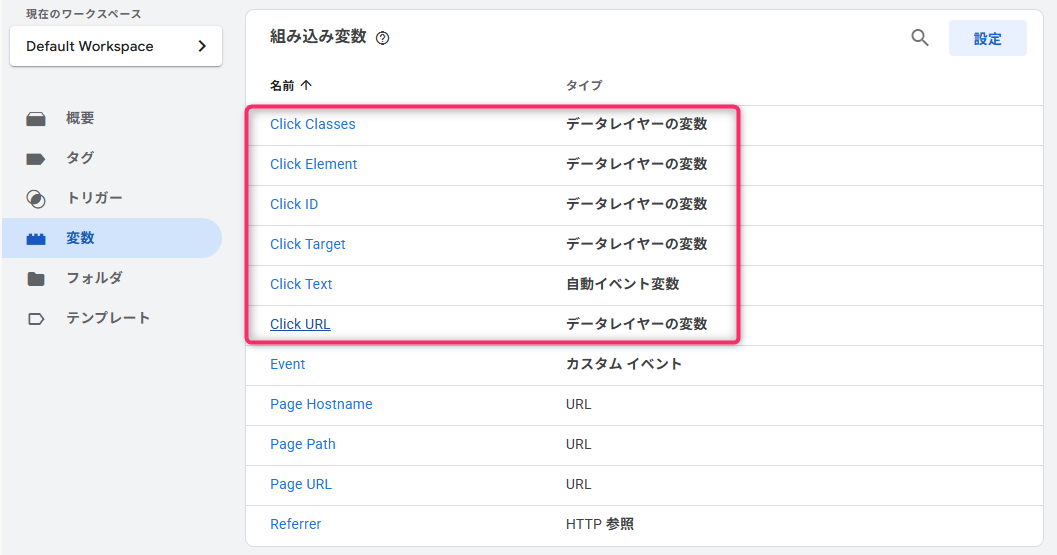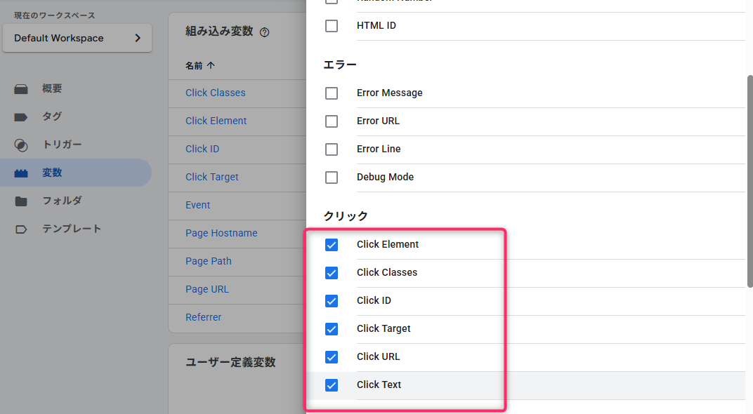 組み込み変数に先ほどクリックした項目が追加されていればOKです。