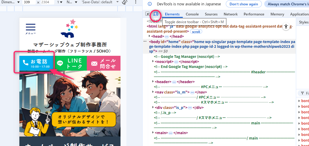 ブラウザの開発者モードを開き(ctrl+shift+i)、モバイルモードを選択、電話ボタン表示させてから押します。
