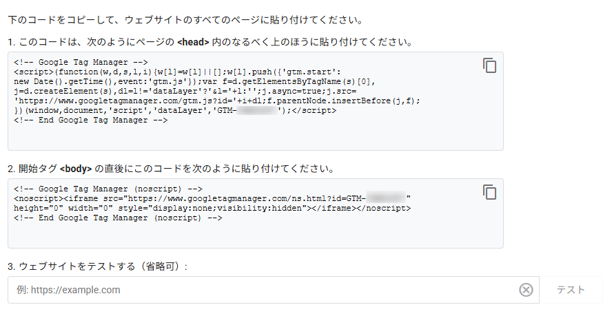 その後、表示されるGTMタグをサイト内のheader、body付近に埋め込みして完了です。