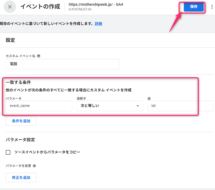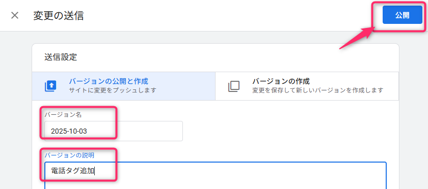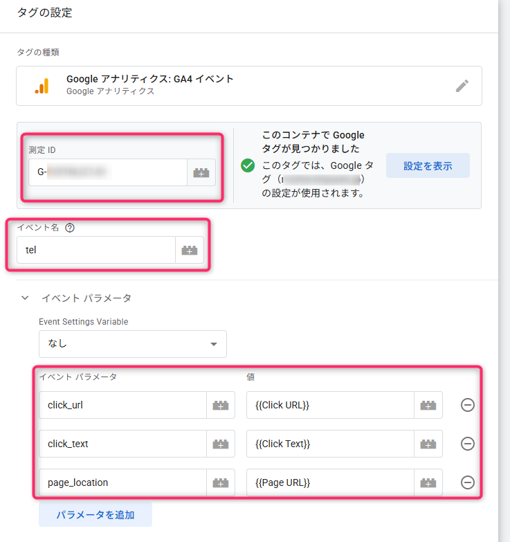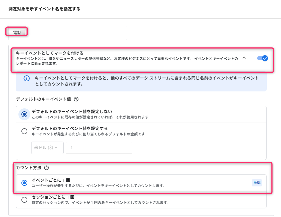 ・値:tel(step5でGTMに設定したイベント名にしてください!)