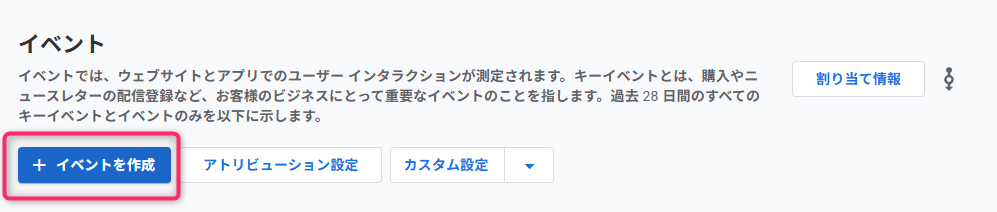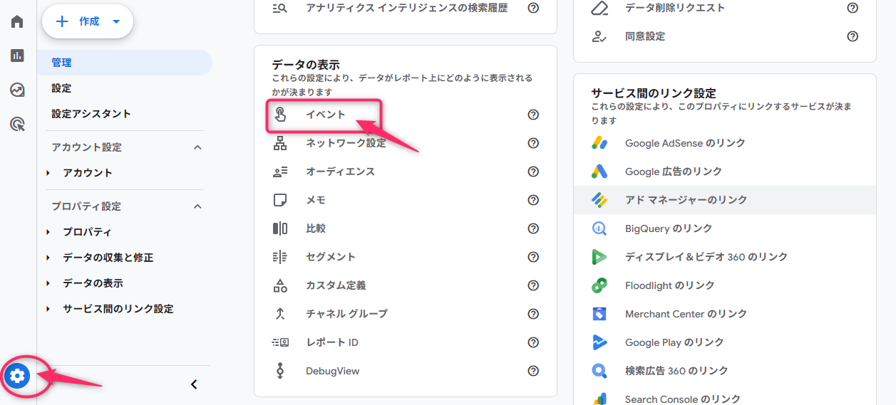 Googleアナリティクス管理画面の「管理(画面左下の青いネジ)」→「イベント」を開きます