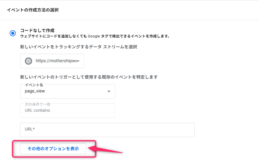 イベントの作成方法の選択で「コードなしを作成」、その他のオプションを表示を選択