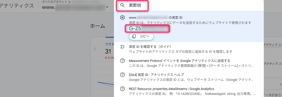 アナリティクスの画面で「測定ID」と検索するとすぐに出てきます。