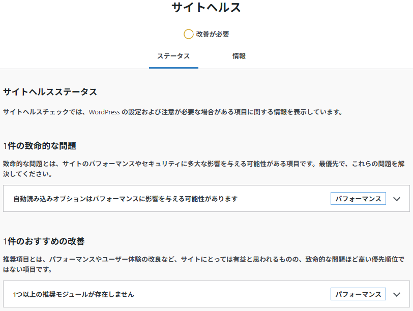 年に数回(保守管理サービスのプランにより回数は異なります)、「サイトヘルス」機能(WordPress標準機能)を確認し、「致命的な問題」は極力解消するよう努めています。